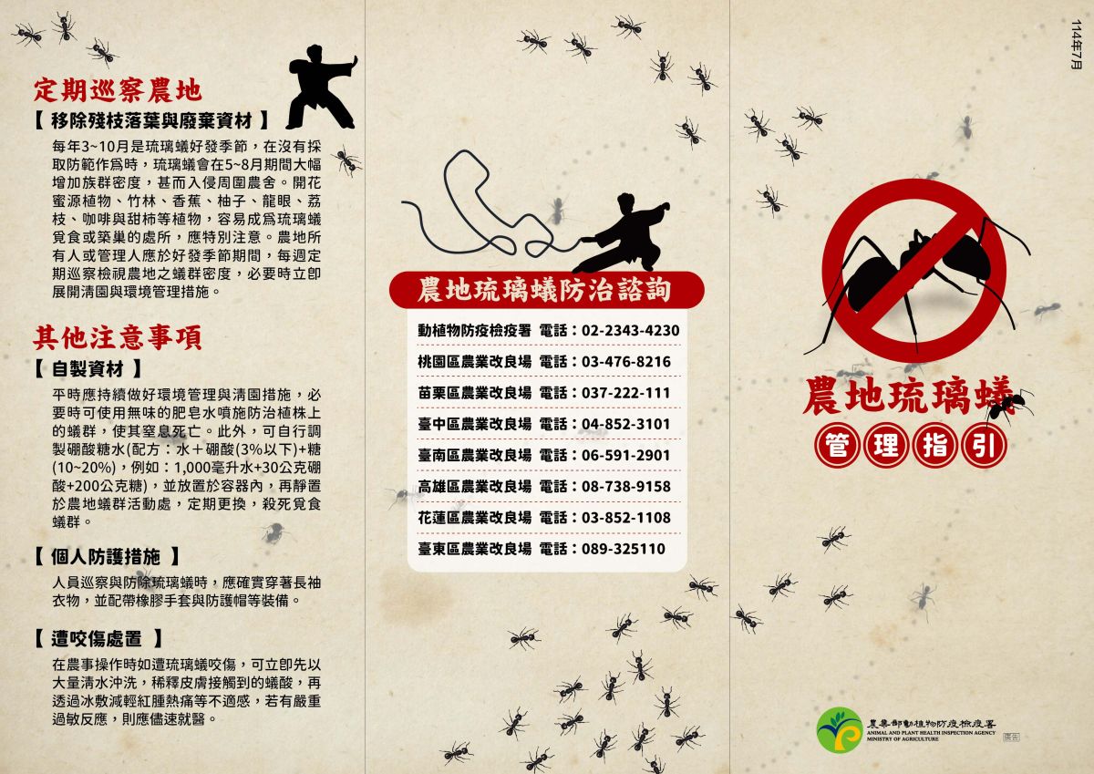 首頁 > 主要業務 > 植物防疫 > 植物防疫資訊 > 農地疣胸琉璃蟻管理專區 > 【摺頁】農地琉璃蟻管理指引